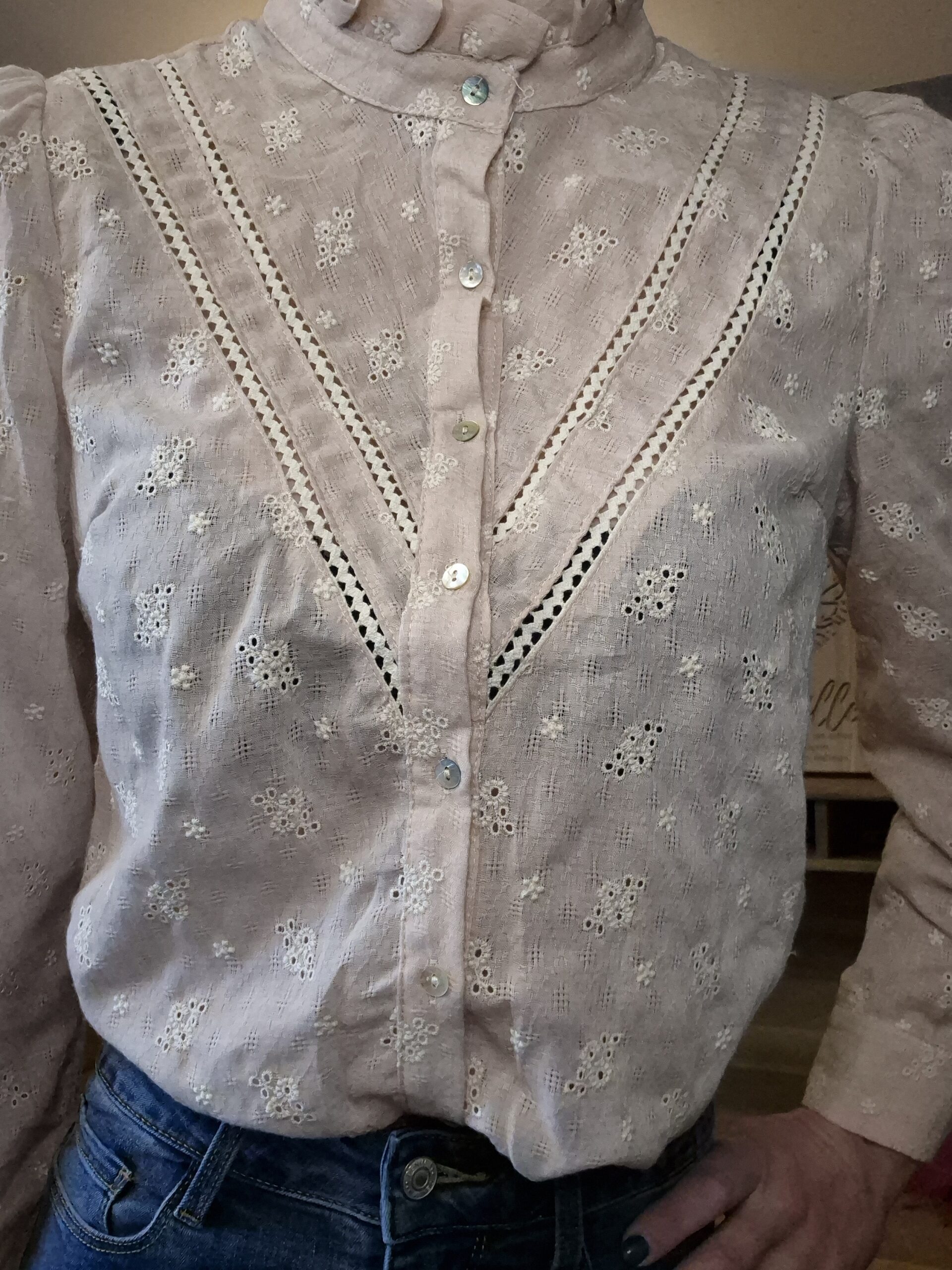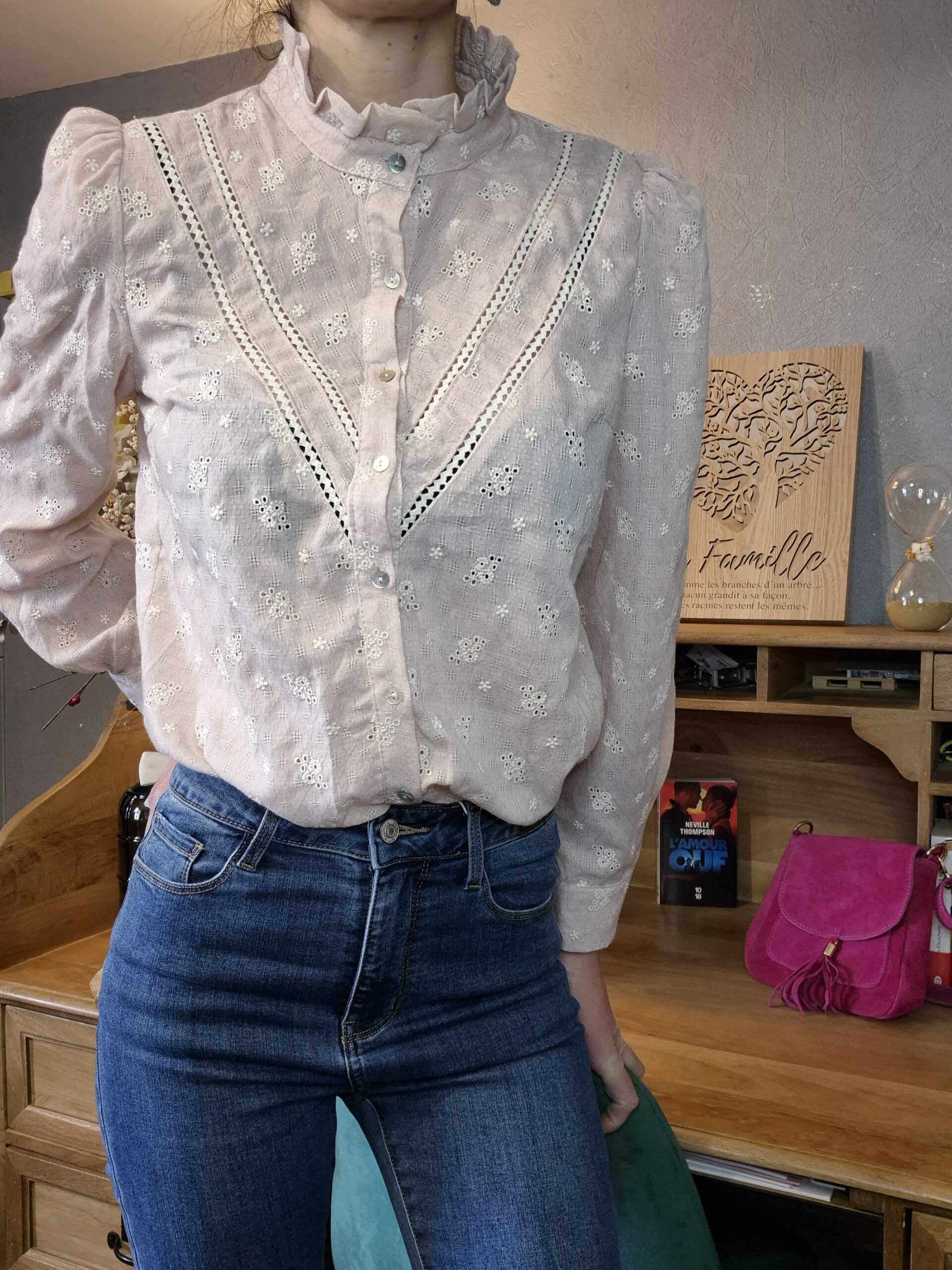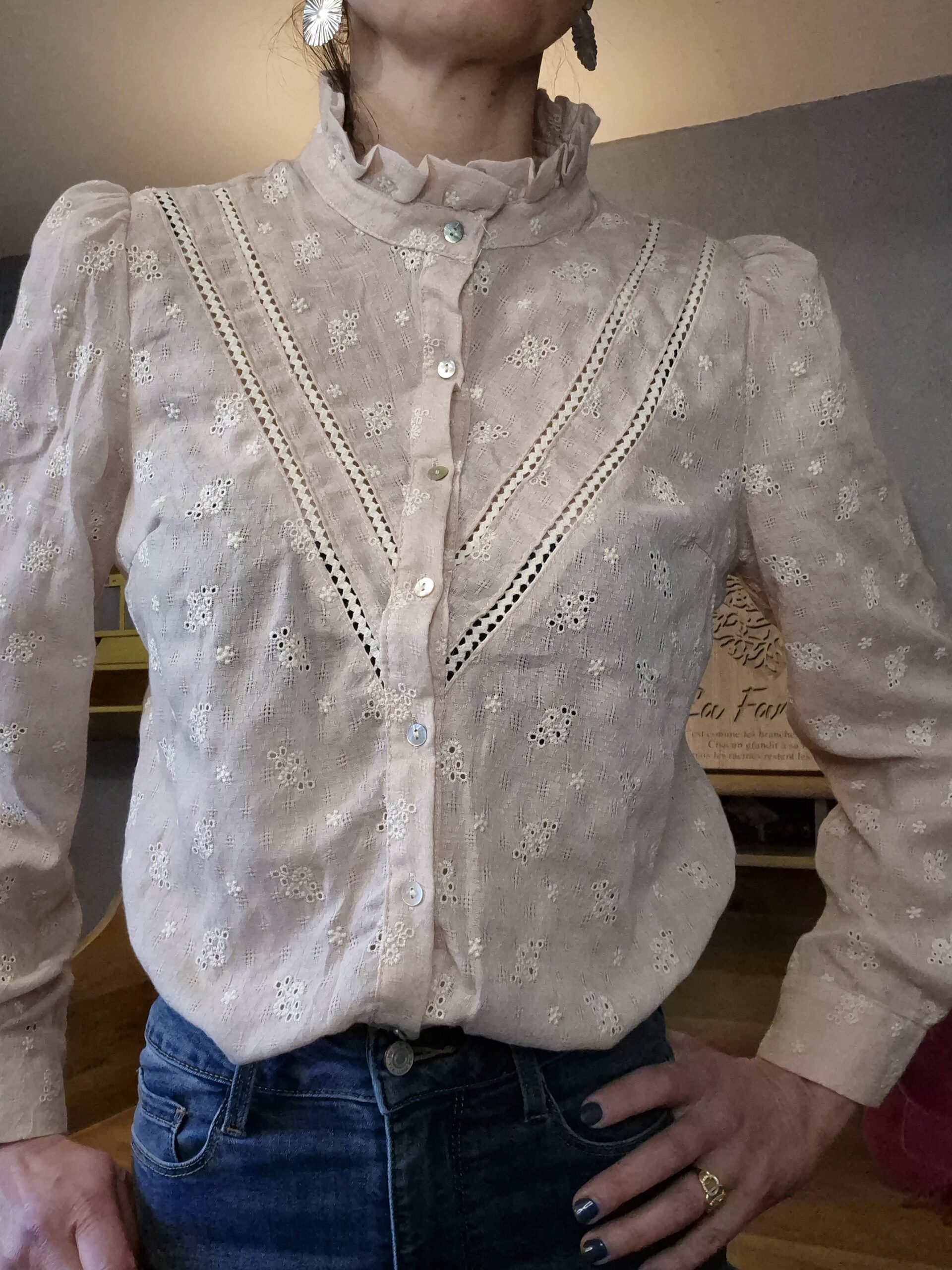 Le charme se cache dans les détails : motifs brodés, dentelle et col volanté twistent en beauté cette sublime blouse.