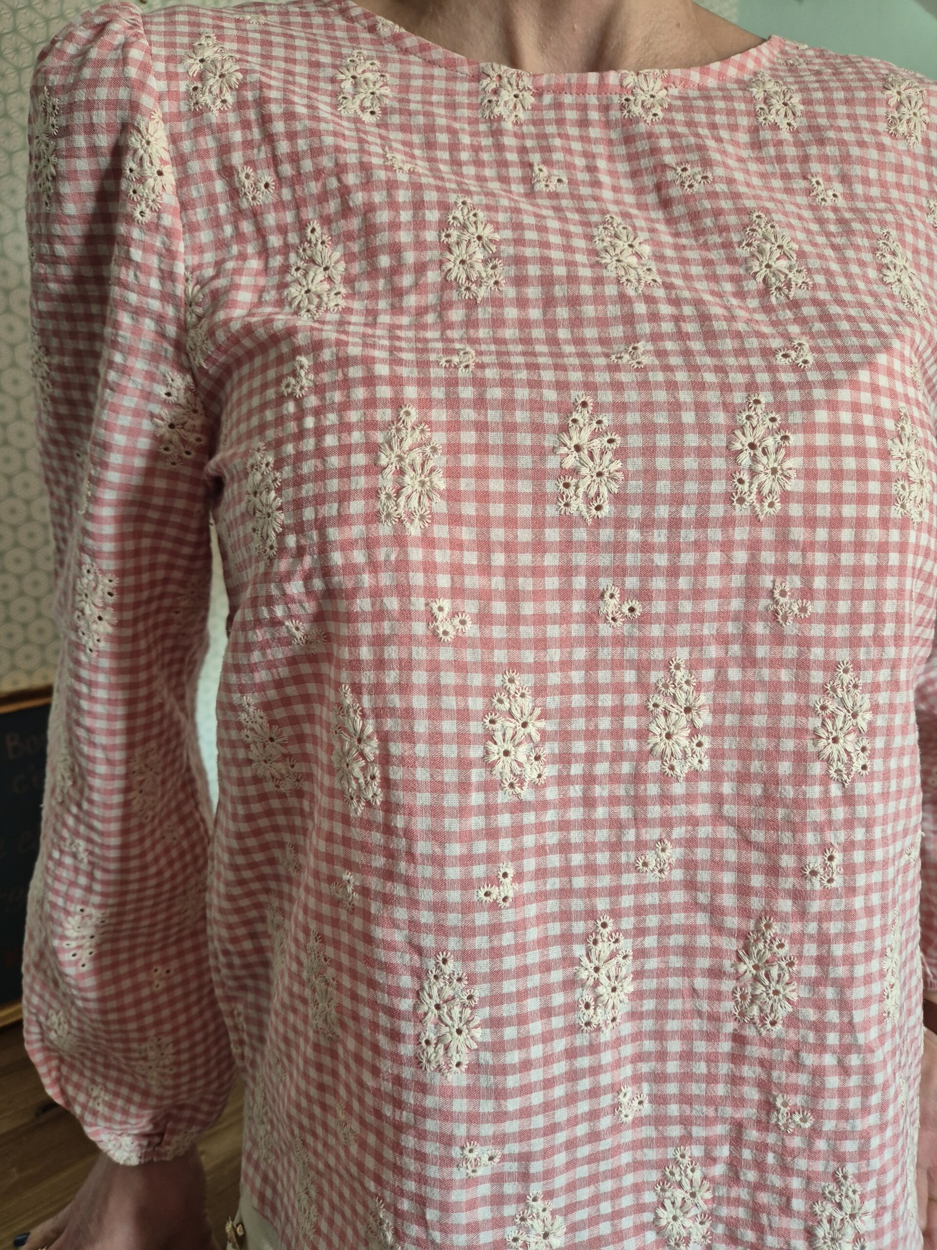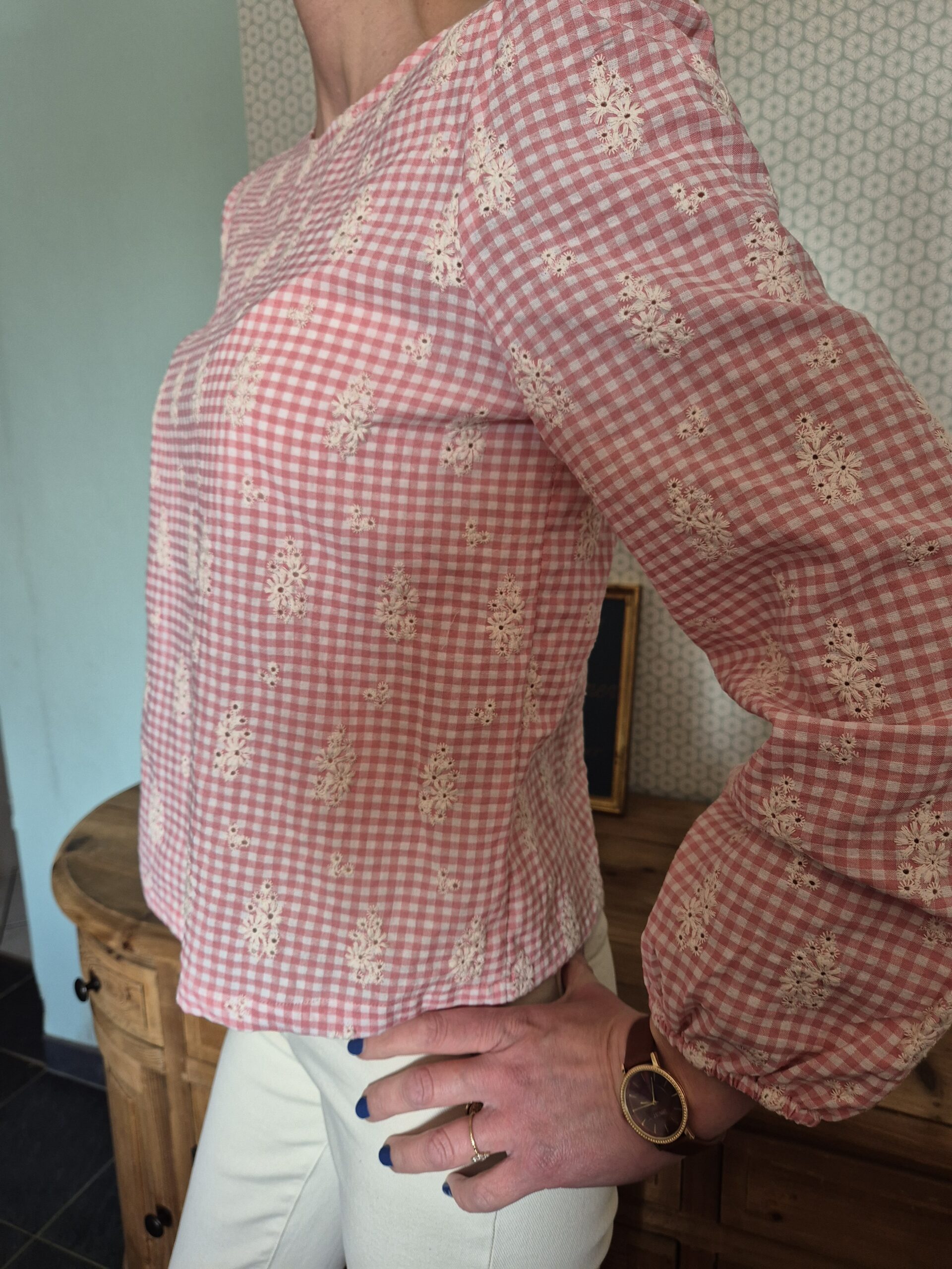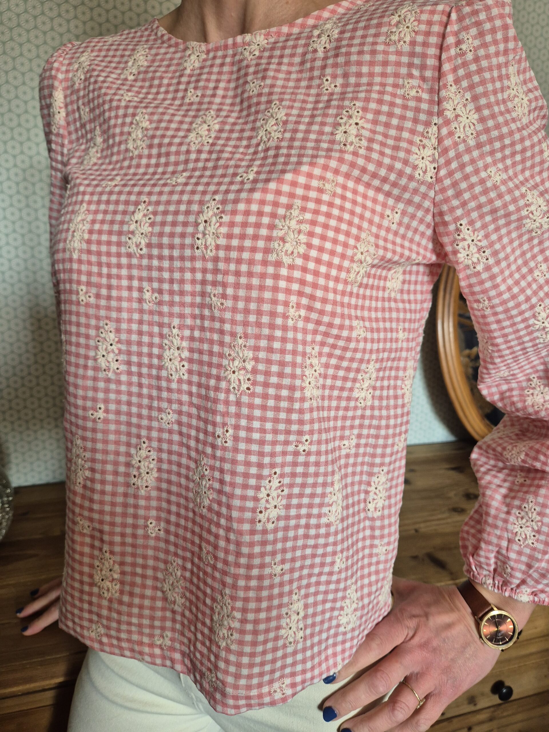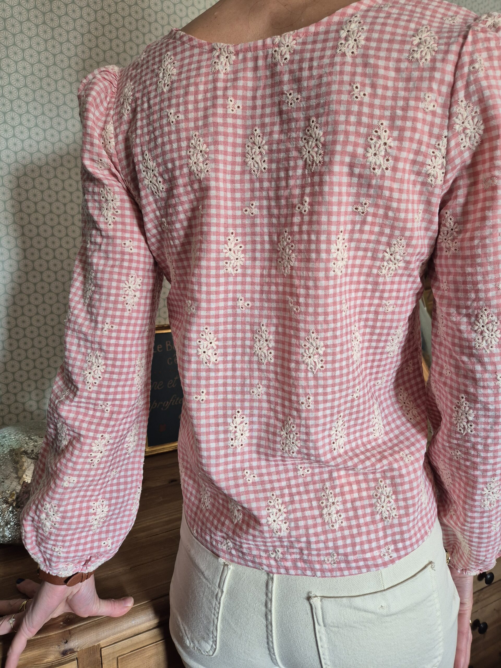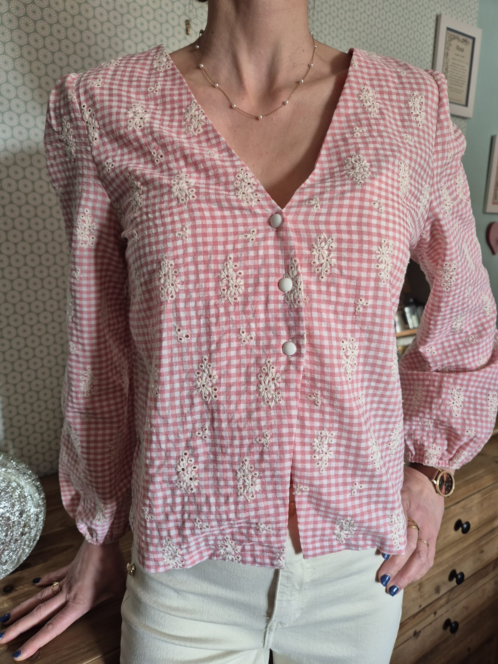 - Blouse rose et blanche à motifs vichy et fleurs brodées