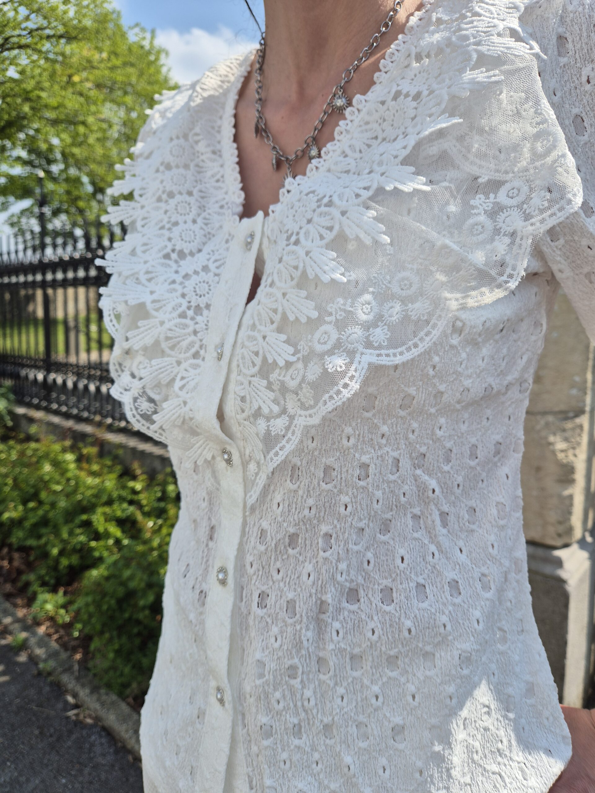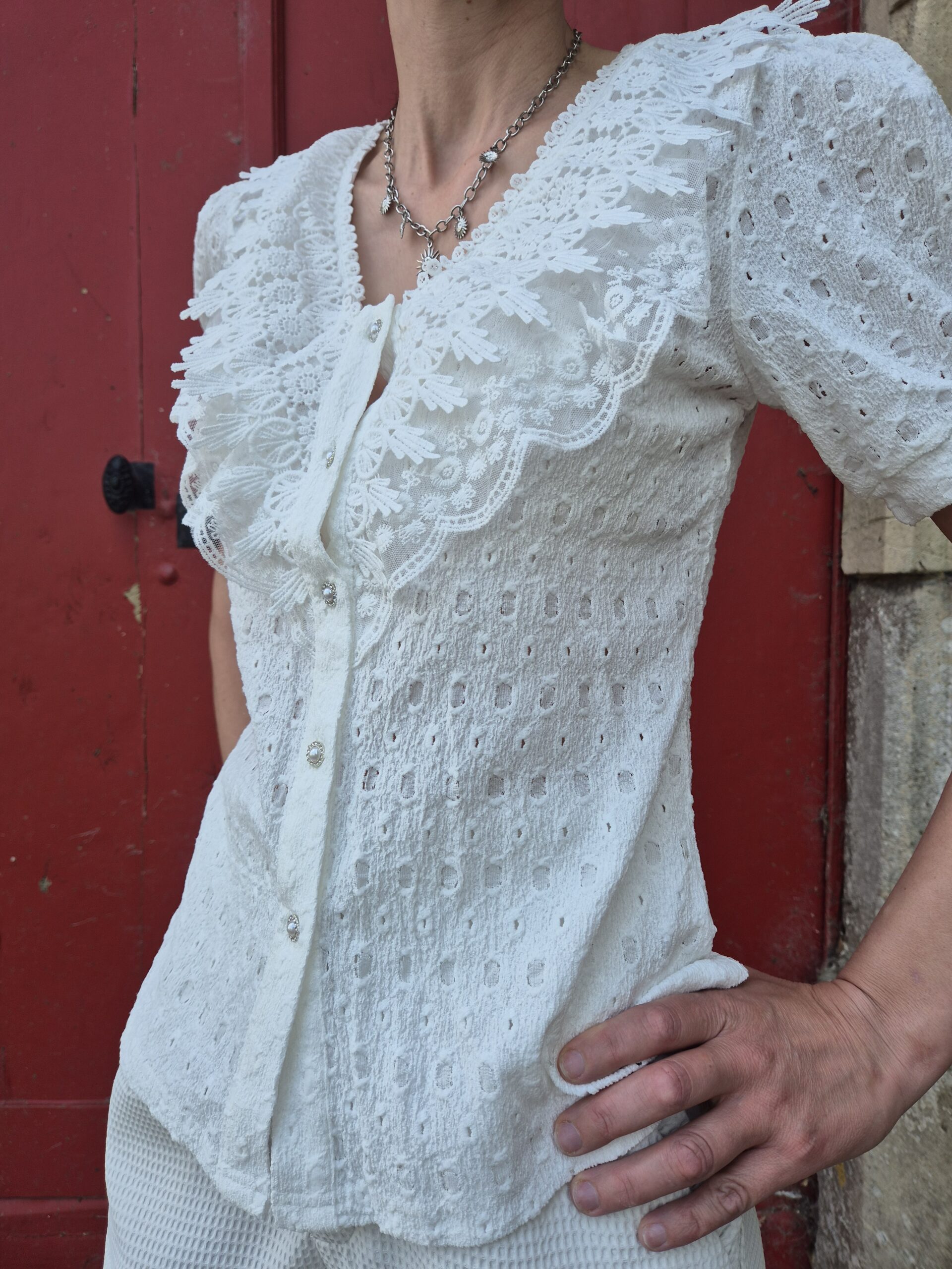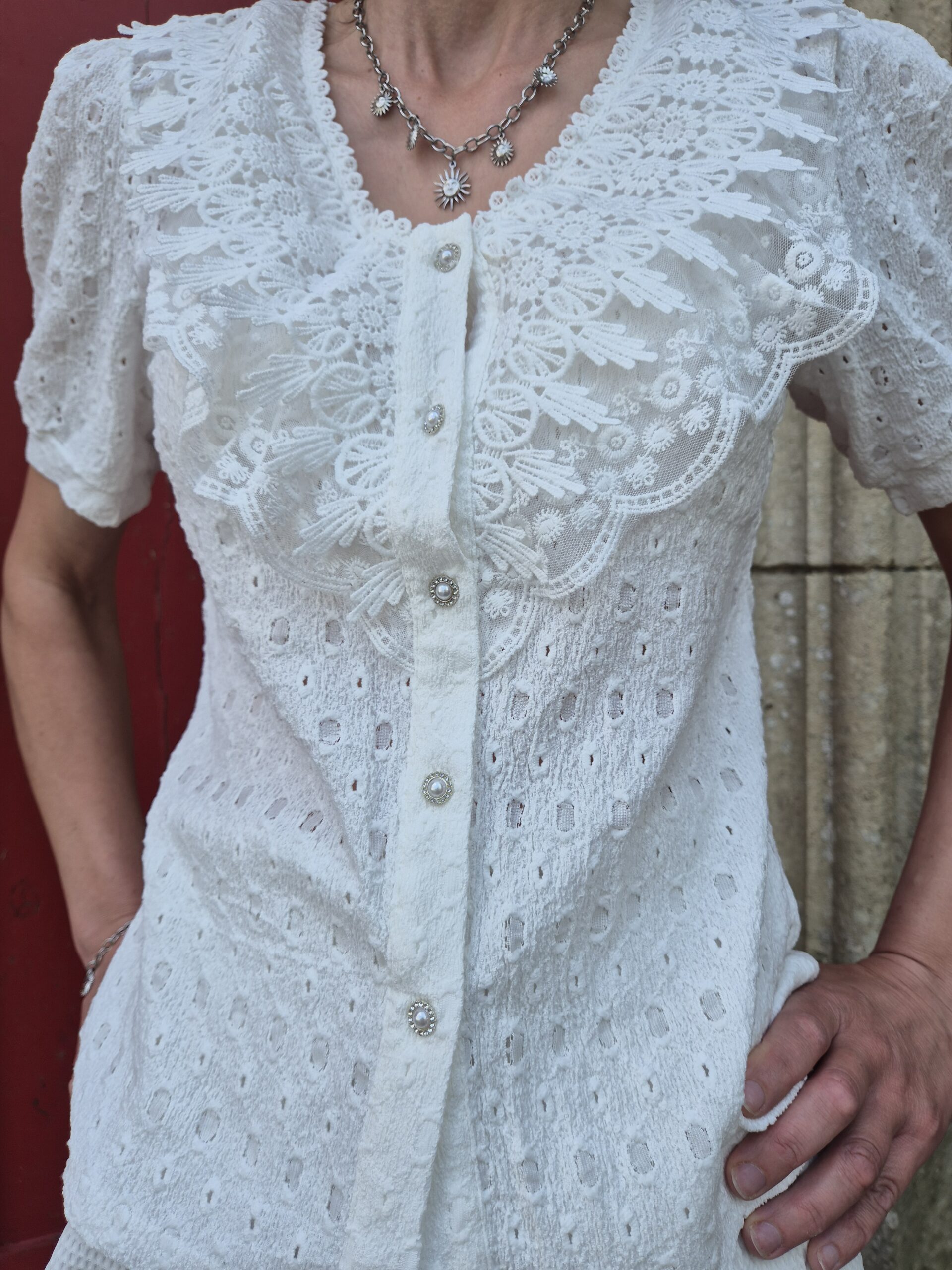 Ses jolis détails brodés, son jeu de transparence au niveau du col, son décolleté en V et ses boutons de perles apportent une touche de féminité et de délicatesse.