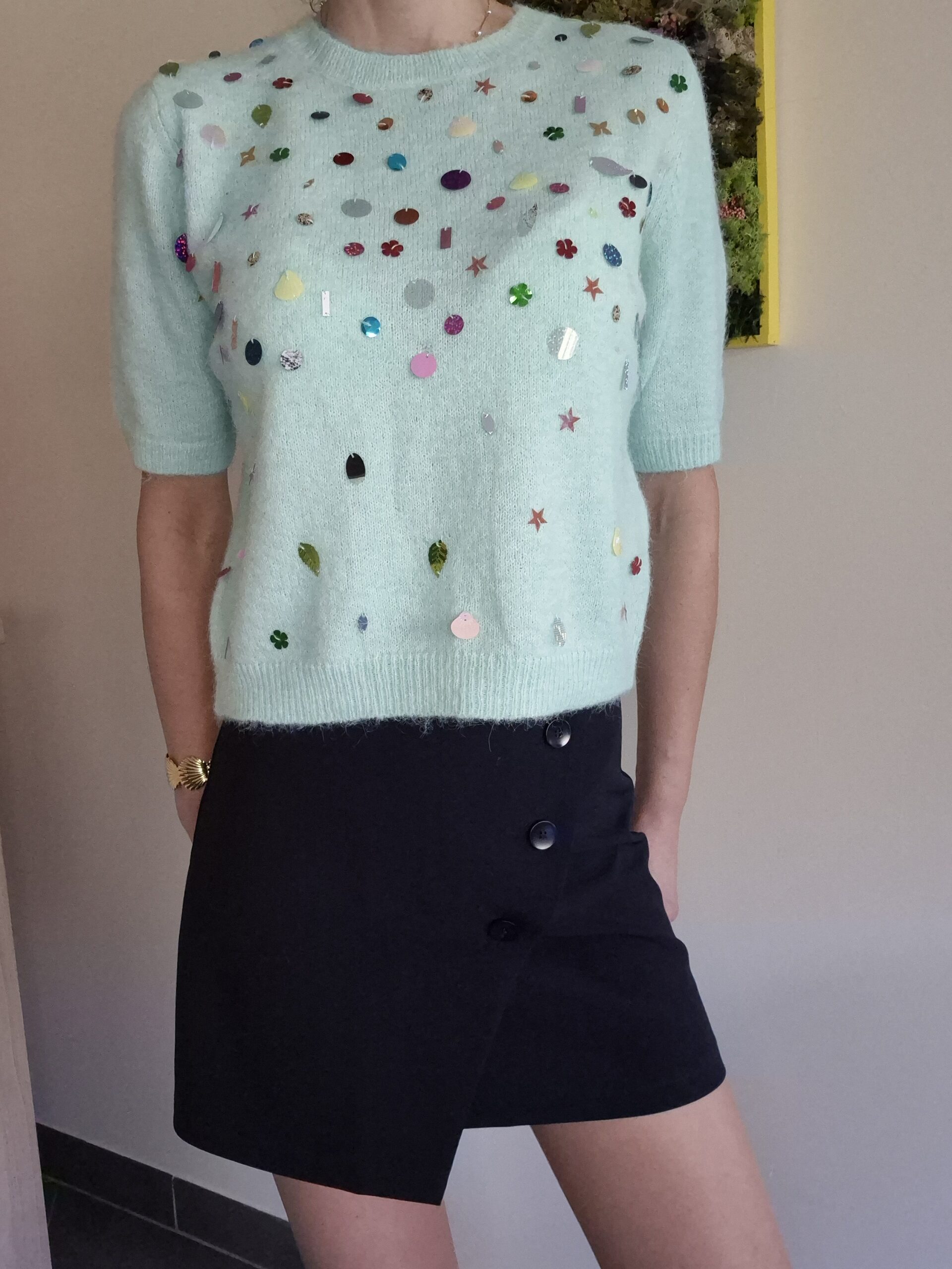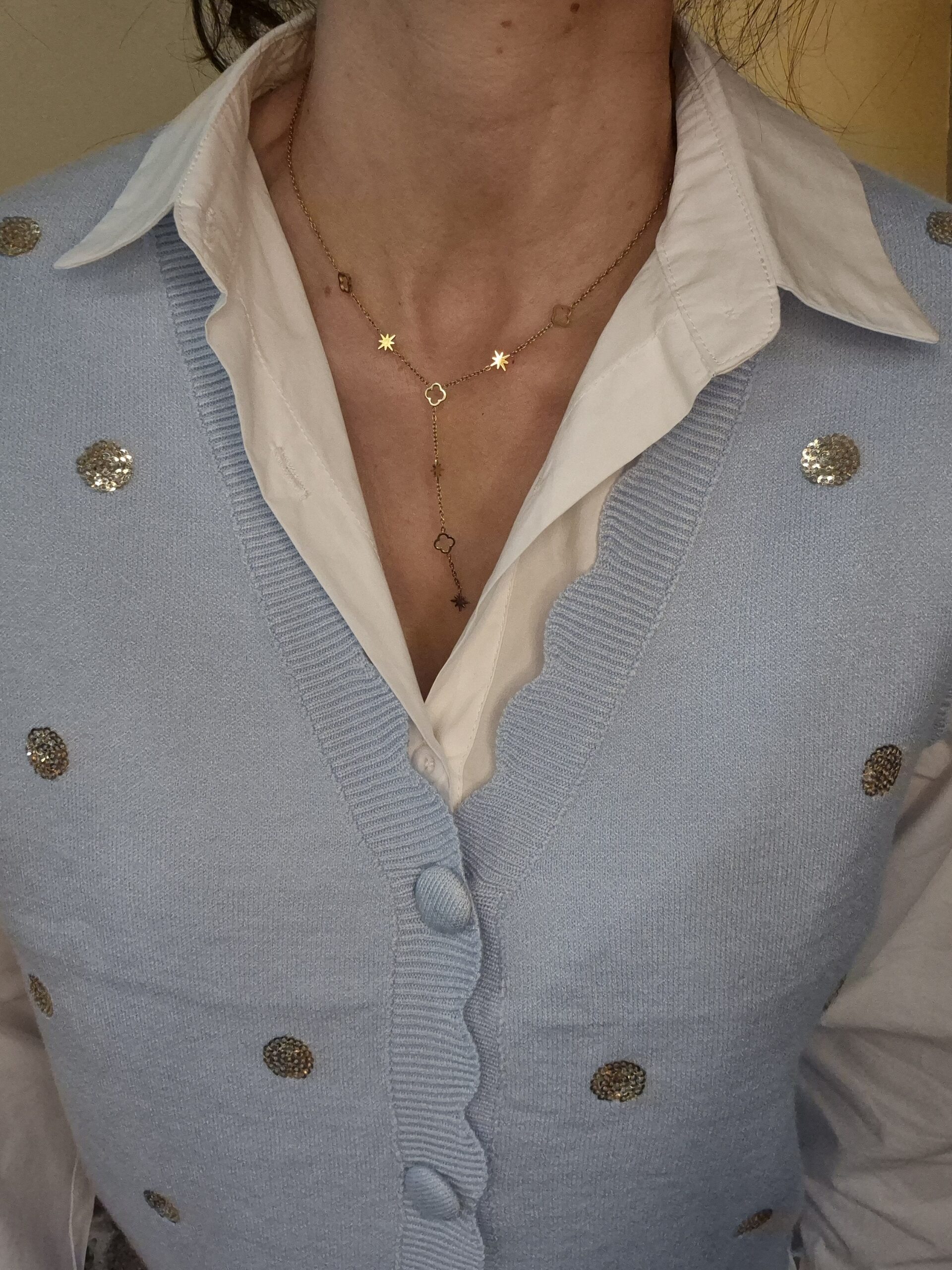 - Bleu ciel avec pois dorés sur le devant, uni sur l’arrière