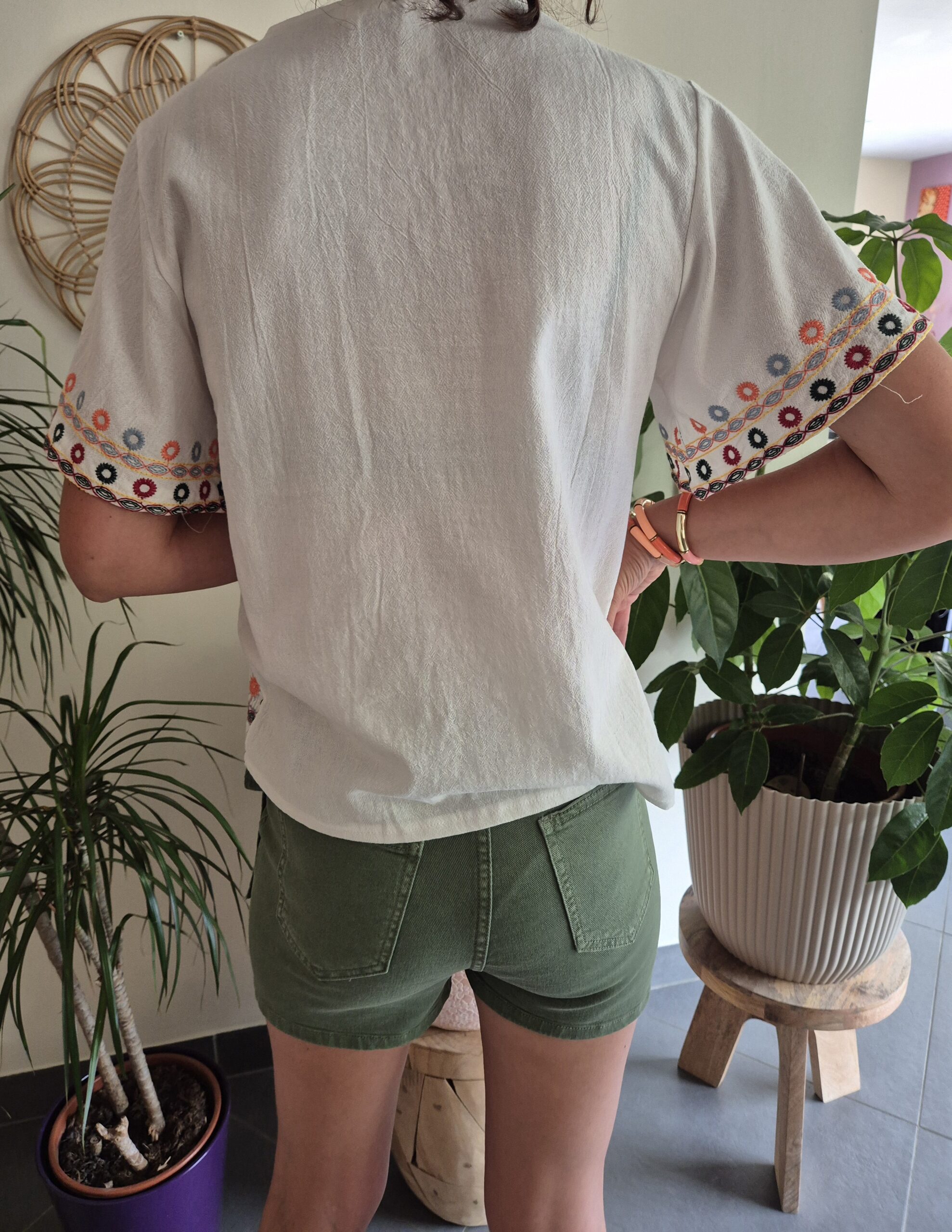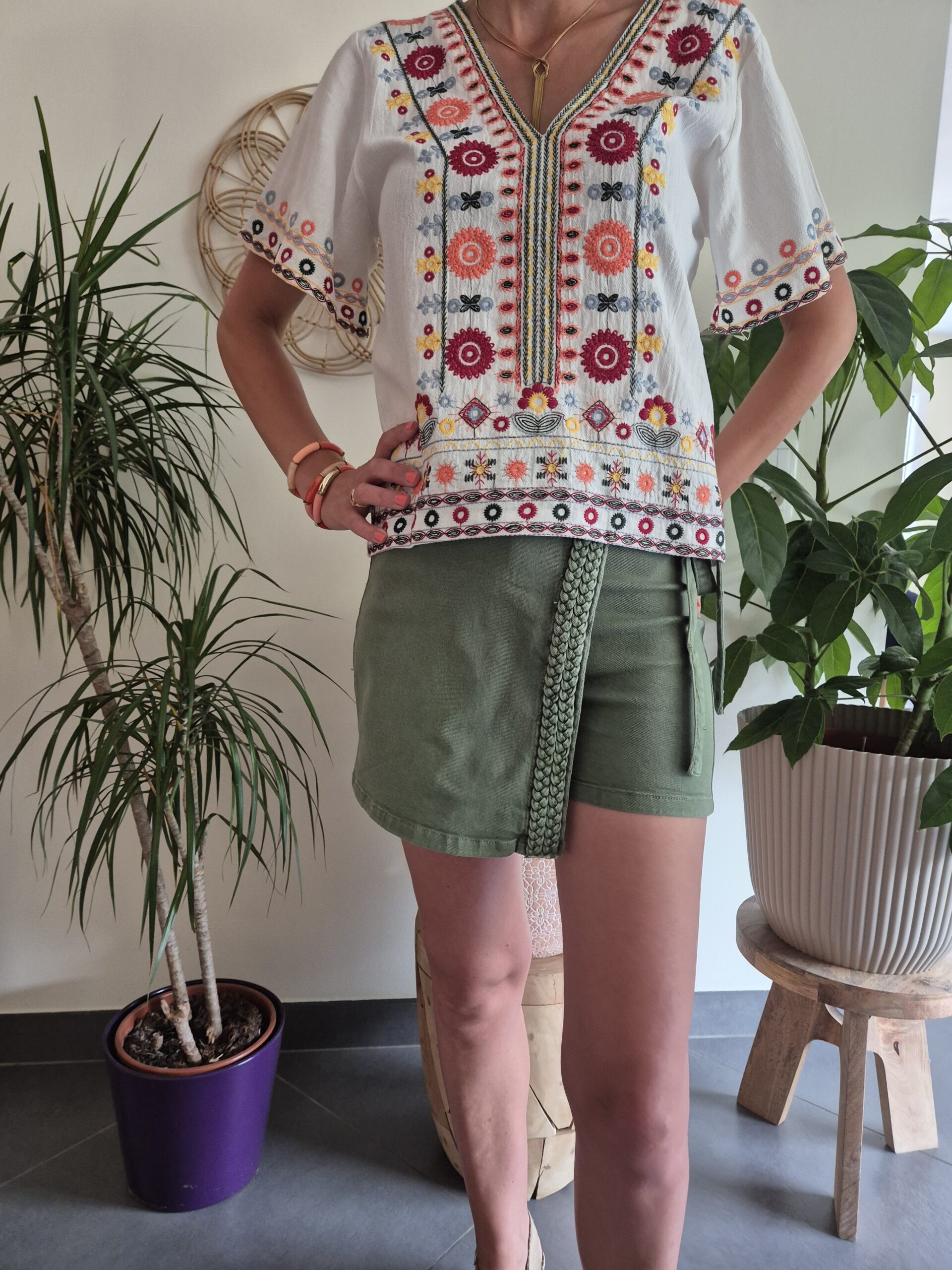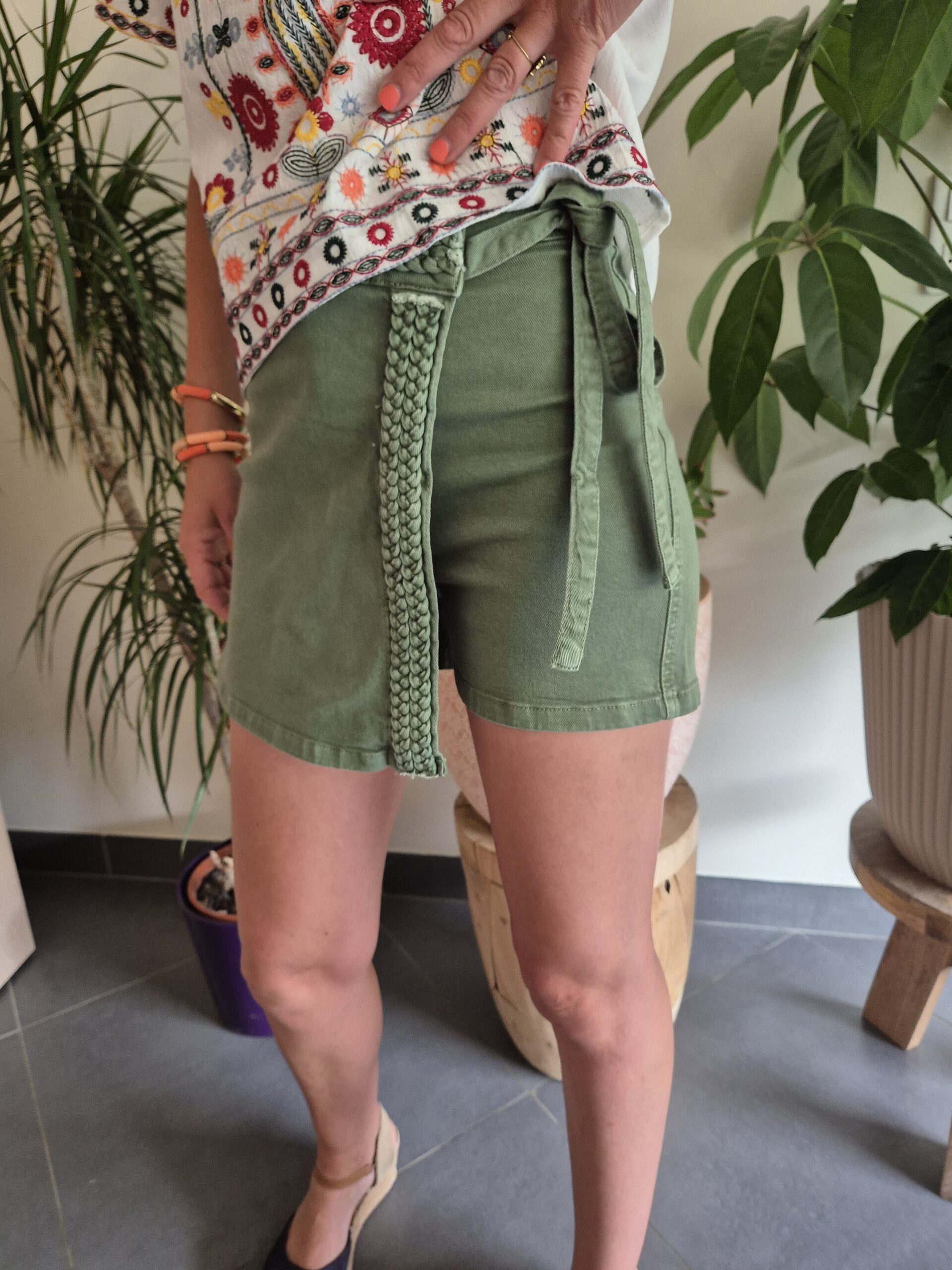 La jupe short Sarabi dévoile tous ses atouts : une longueur mi cuisse pour la séduction, une coupe short pour le confort, des détails tressés pour le style et une couleur kaki tendance.