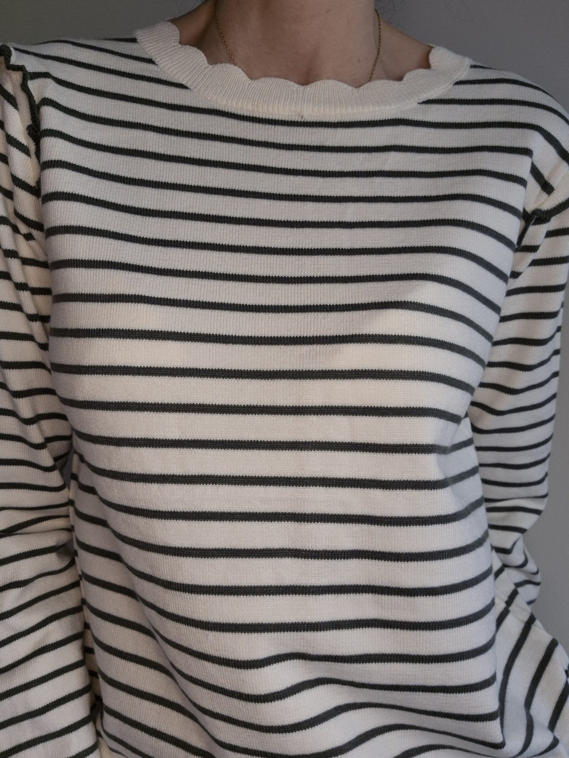 Arthur, notre pull marinière ultra féminin avec ses fines rayures, ses bords festonnés et ses détails volantés aux épaules sera parfait pour sublimer vos tenues.