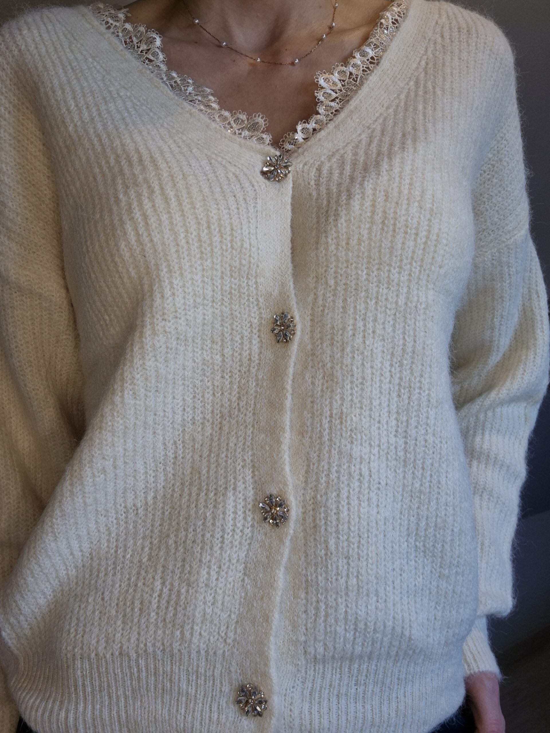 On adore sa coupe intemporelle, son extrême douceur et ses détails petites perles qui apportent une touche d’élégance et de féminité.