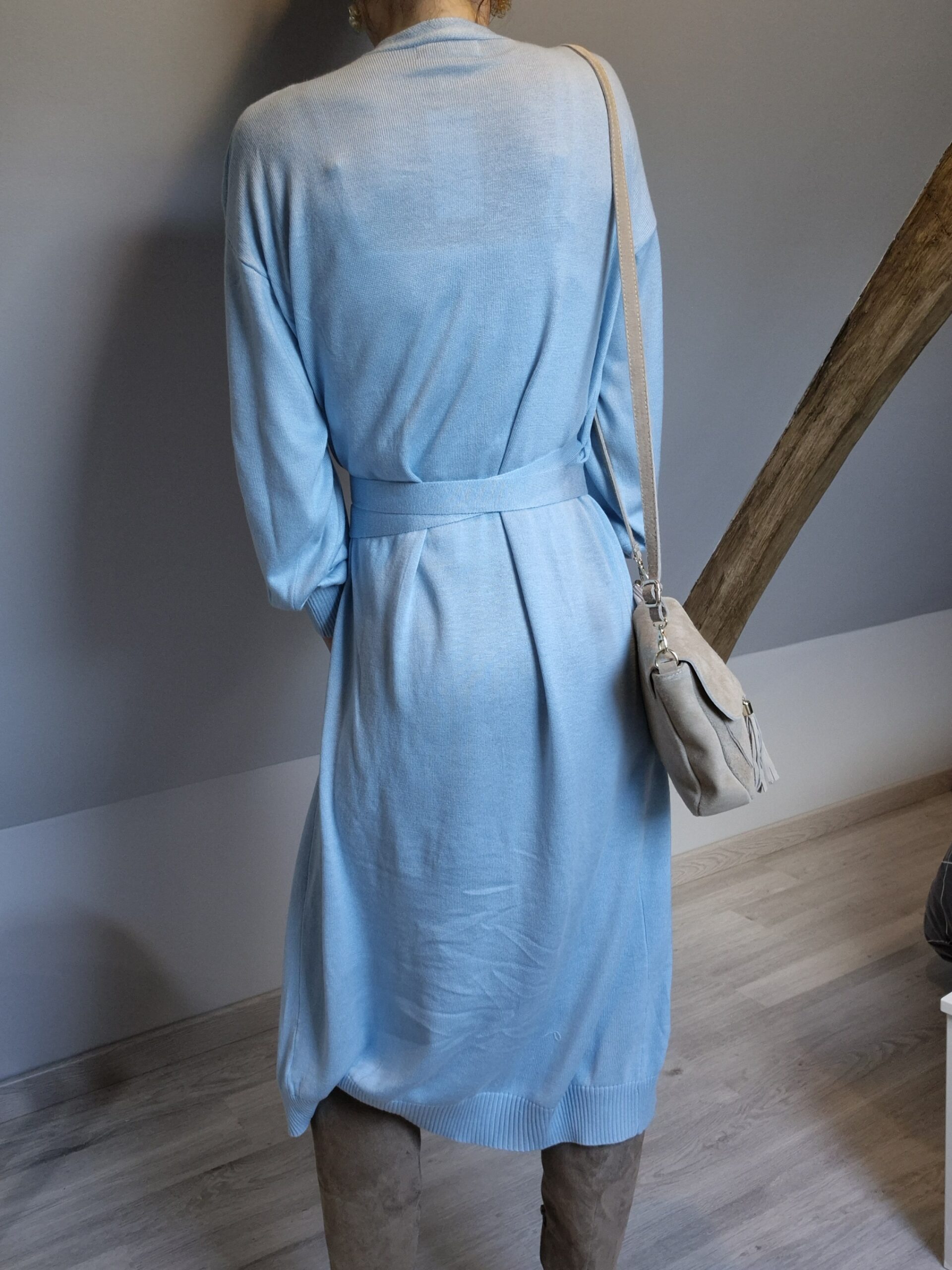 On craque pour sa coupe fluide flatteuse ultra confort, sa ceinture assortie qui marque la taille comme il faut et son doux coloris bleu ciel.